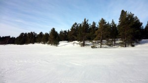 Tästä olisi ollut hyvä edetä moottorikelkkauraa pitkin, mutta vettä oli tässäkin. Oli pakko valita joko pitkä kiertoreitti kauempaa vasemmalta tai paluu samoja jälkiä vähän takaisin päin ja siirtyminen saareen – siellä edessä olisi kuitenkin ollut puoli metriä upottava pehmeä lumi, joten vaihtoehtoja oli käytännössä vain yksi.