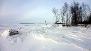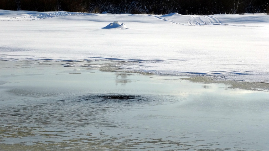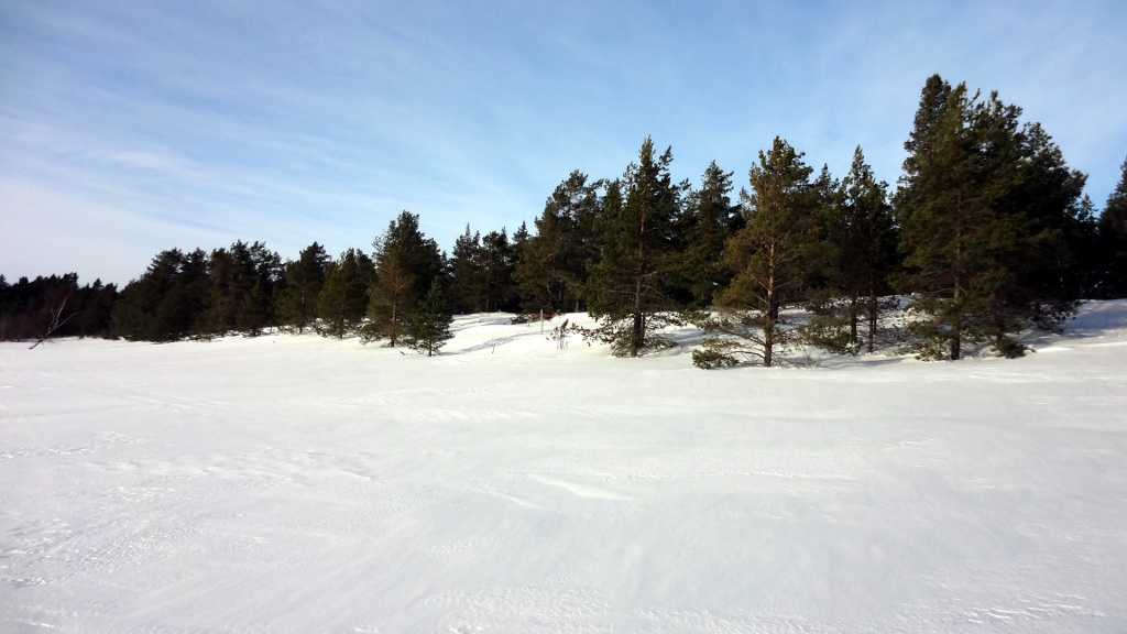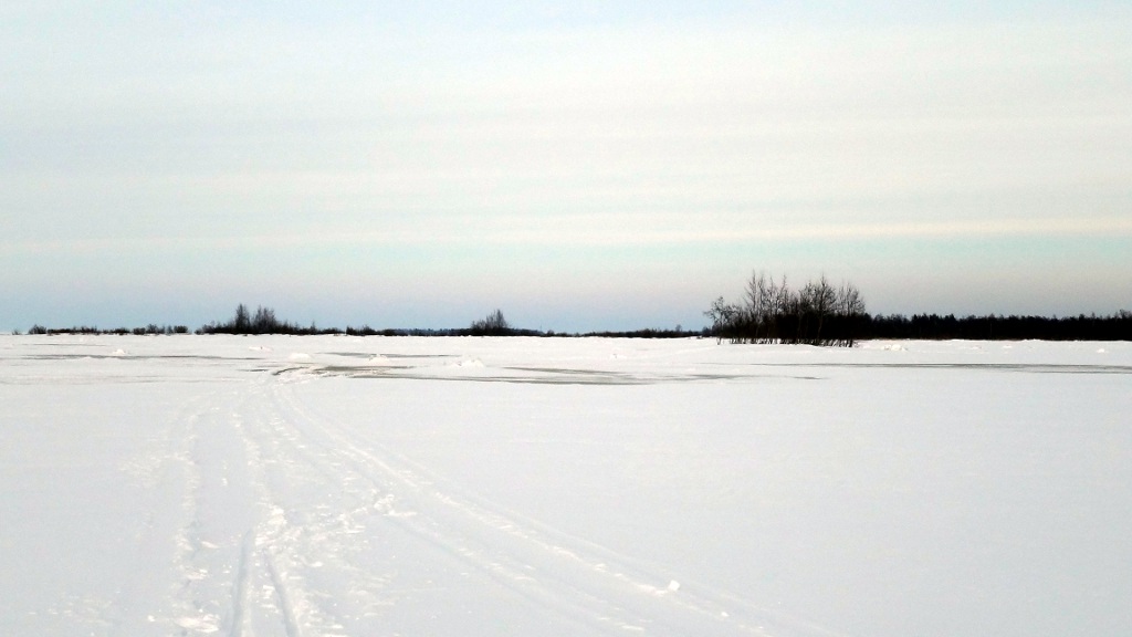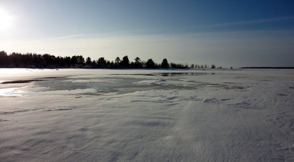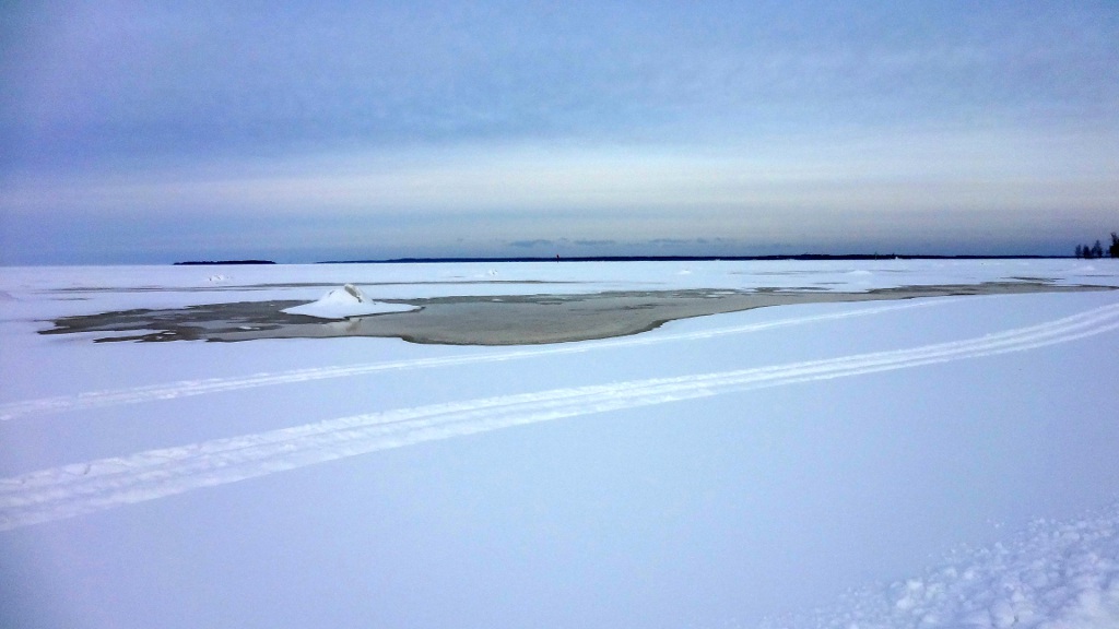 Tämä ylellisyys loppui kuitenkin heti rannassa, enkä sitä kyllä pannut ollenkaan pahakseni. Minä kun en erityisemmin latuhiihdosta välitä, minulle umpihankihiihto on sitä oikeaa hiihtämistä. Rannan tuntumassa jäällä oli vettä, minkä arvelin johtuvan voimakkaasta ja jo jonkin aikaa jatkuneesta etelätuulesta. Koska jää on rannan lähellä kiinni rannassa ja paikoin pohjassakin, ei se jousta veden korkeusvaihteluiden mukana, ja nouseva vesi purkautuu halkeamien kautta jään päälle. Tässä vaiheessa päivää vesi oli noussut viimeisimmästä minimikorkeudestaan jo parikymmentä senttiä, ja lisää oli tulossa retkeni aikana saman verran, minkä kyllä myöhemmin tulin huomaamaan.