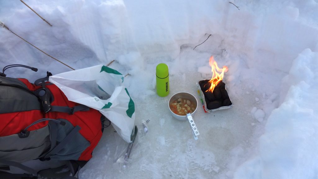 Lounaspaikkaa ei tarvinnut etsiä kovin kauaa. Se löytyi heti seuraavan niemen suojista – paikasta, jonka nimi sopi kyllä tähän tarkoitukseen oivallisesti: Köökinhylly. Etsiydyin sisämaahan menevää moottorikelkkauraa pitkin suojaiseen paikkaan, nousin pois suksilta, otin lapion ja kaivoin lumeen pienen kuopan. Siinä kohtaa alla olikin tasaista jäätä – lienee vuodenvaihteen myrskyissä rannalle noussut jäälevy – mikä oli vallan mainio alusta retkigrillilleni. Tässä olen juuri sytyttänyt sen ja sytytysneste palaa iloisella liekillä.