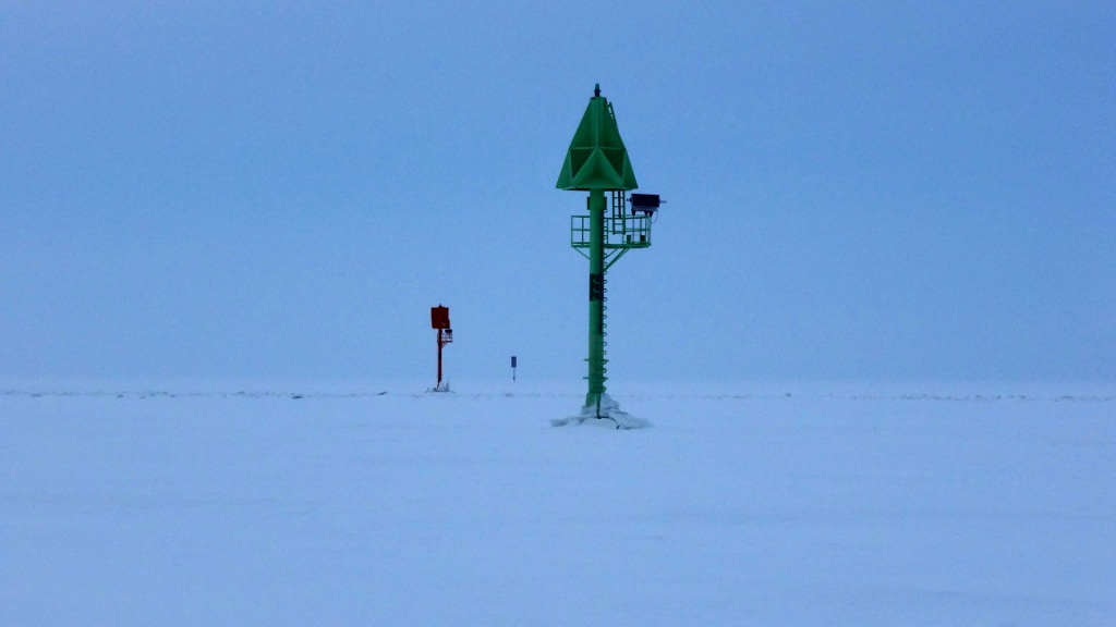 Kartta oli luonnollisesti mukana, sen olin tehnyt Kansalaisen karttapaikalta tulostamalla, ja tulosteen suojasin vedenpitävään karttataskuun. Kompassi oli myös mukana, ja varalta olisi ollut käytettävissä vielä kännykän GPS-toiminnot. Kokemuksesta tiesin, että jäällä voi sopivissa olosuhteissa näkyvyys hävitä kokonaan, jos lumisade valkaisee maiseman joka puolelta. Silloin ei maamerkkien perusteella pysty suunnistamaan, ja laivaväylän läheisyydessä eksyminen ei ole leikin asia.