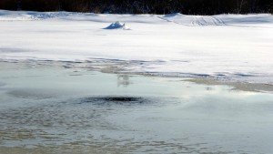Myös täällä oli vesi noussut jäälle. Kuten kuvasta näkyy, vetiset paikat olivat lähellä rantaa, joten tässä kohtaa valitsin reitin kauempaa.
