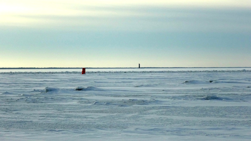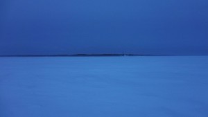 Virpiniemen rantaa kohti käännyttyäni alkoi valo jo käydä vähiin. Avomereltä puhaltava tuuli oli voimistunut 12,5 metriin sekunnissa, mikä heilutti kevyen hiihtäjän tasapainoa jo melkoisesti. Erityisen hankalaa oli niissä kohdissa, joissa tuuli oli vienyt kaiken irtolumen pois jäältä, eikä suksissa ollut pitoa mihinkään suuntaan – ei edes sivuille. Asiaa ei toki auttanut se, että olin jo todella väsynyt.