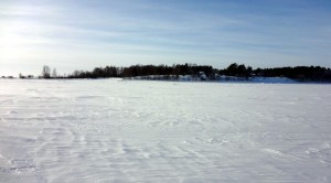 Tämän pienen kohouman jälkeen alkoi tasainen jäälakeus. Kaukana näkyy oikealla kohteena oleva Hietakari ja sen vasemmalla puolella Kotakari.