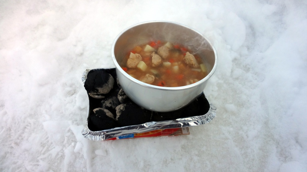 Evääksi olin varannut Saarioisten siskonmakkarakeittoeineksen, kuusi Gifflar-pullaa, puoli levyä Fazerin sinistä, termospullollisen kahvia ja puoli litraa vettä. Ruuan lämmityksen olin suunnitellut tapahtuvaksi grillihiilillä, niitä olin laittanut alumiinivuokaan ja mukana oli myös sytytysnestettä ja tietysti sytytin.