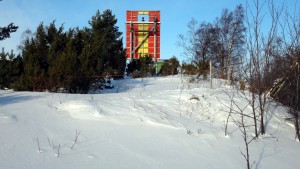 Alun perin ajatukseni oli nousta maihin yllä olevassa kuvassa keskellä näkyvää loivaa rinnettä pitkin. Maanomistaja oli kuitenkin vetänyt siihen punaisen köyden osoittamaan, että tästä ei mennä, eikä siitä kyllä olisi menty muutenkaan. Oli upottavaa lunta niin paljon, että kun yhdessä kohtaa vähän horjahdin ja otin kaatuessani kädellä tukea, se upposi lumeen kainaloa myöten. Olihan siihen pehmeä kaatua, mutta pystyyn kömpiminen oli oma operaationsa, kun mistään ei oikein saanut tukea.
