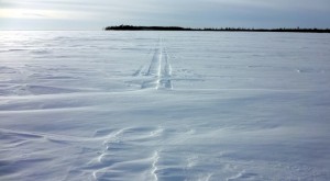Lounastaukoon meni melko tarkkaan tunti. Sinä aikana ehdin sopivasti levätäkin, mikä oli ihan hyvä asia – olihan matkasta suurin osa vielä edessä. Kerättyäni kaikki roskat mukaan ja siistittyäni paikat lähdin jatkamaan. Ohitseni meni yksi moottorikelkka, hiukan oman reittini vasemmalta puolelta, ja ajattelin yhyttää sen jäljet, joita pitkin olisi helppo hiihtää. Ei siitä juuri iloa ollut, sillä jo viidessä minuutissa tuulen kuljettama irtolumi oli täyttänyt kelkan jättämän uran.