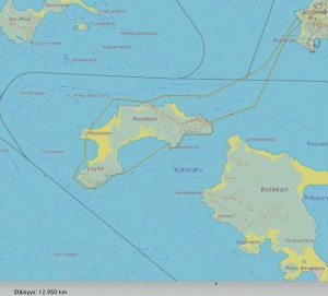 Aamulla söin hyvän aamiaisen ja rupesin sen jälkeen varustautumaan taipaleelle. Tiedossa oli, että retkestä tulee raskas ja arvioin siihen menevän noin kuusi tuntia. Matkan pituuden olin arvioinut noin 12 kilometriksi, ja kokemuksesta tiedän, että tällaisella retkellä keskinopeus tulee olemaan enintään kaksi kilometriä tunnissa. Tässä on kartta retkireitistä, tein sen OpenSeaMap -sivustolla – parempiakin karttapalveluita netissä olisi, mutta tämä on sovelias tällaisen blogitekstin yhteyteen. Kartta avautuu isompana, kun napsautat sitä.