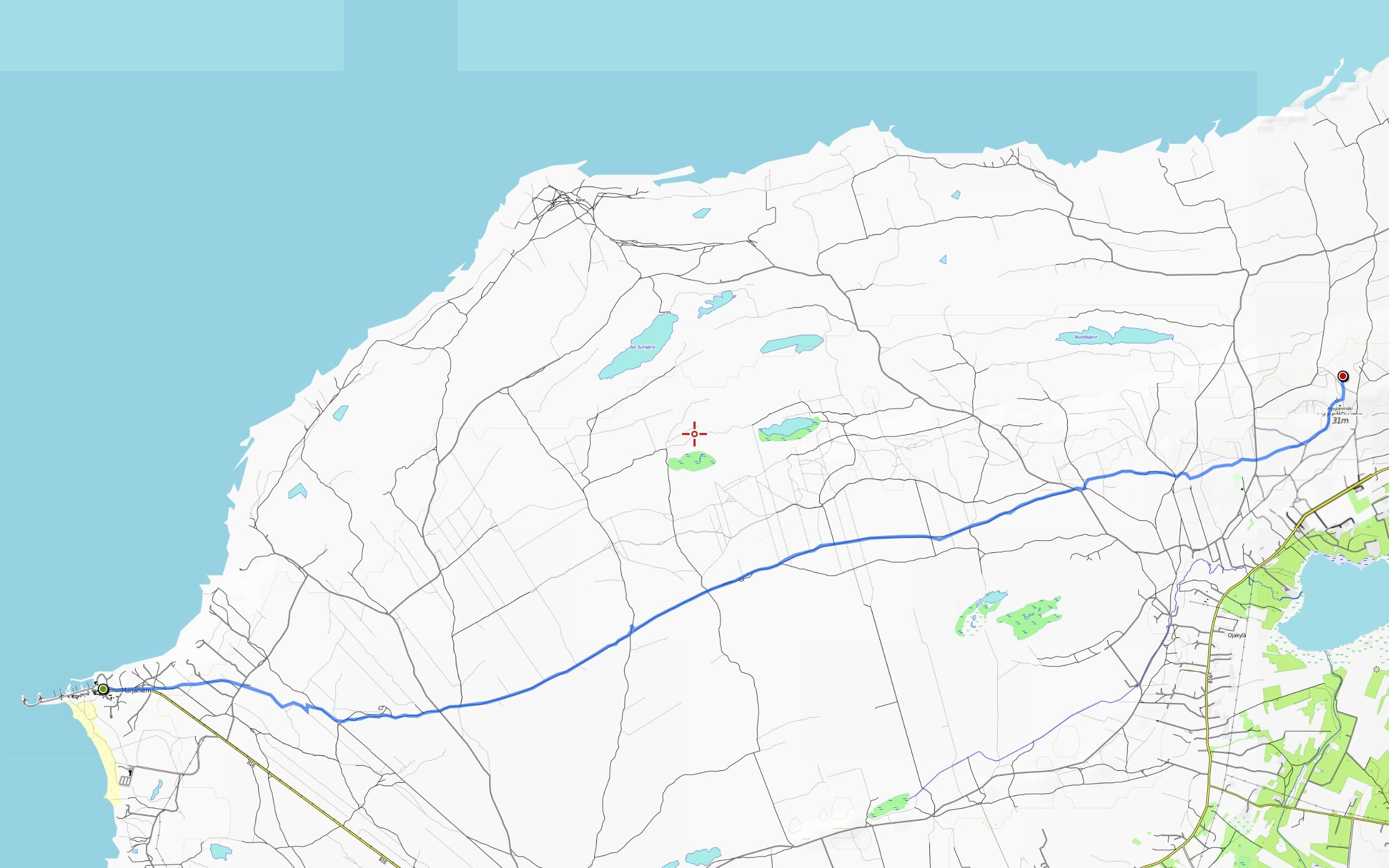 Linja-autokyyti olisi sikäli omalla autolla menemistä mukavampi vaihtoehto, että silloin patikointi olisi mahdollista aloittaa ja lopettaa eri paikkoihin. Nyt meillä ei ole tätä ylellisyyttä, joten ajamme auton Marjaniemeen ja aloitamme retkemme sieltä. Mutta emme ihan heti. Marjaniemeen saapuessamme sataa. Tarkistamme netistä sadetutkan ja kyseessä on nopeasti ohimenevä kuuro. Istumme siis autossa noin varttitunnin odottelemassa sateen loppumista. Ollaan me aikamoisia karpaaseja, totean Akille.