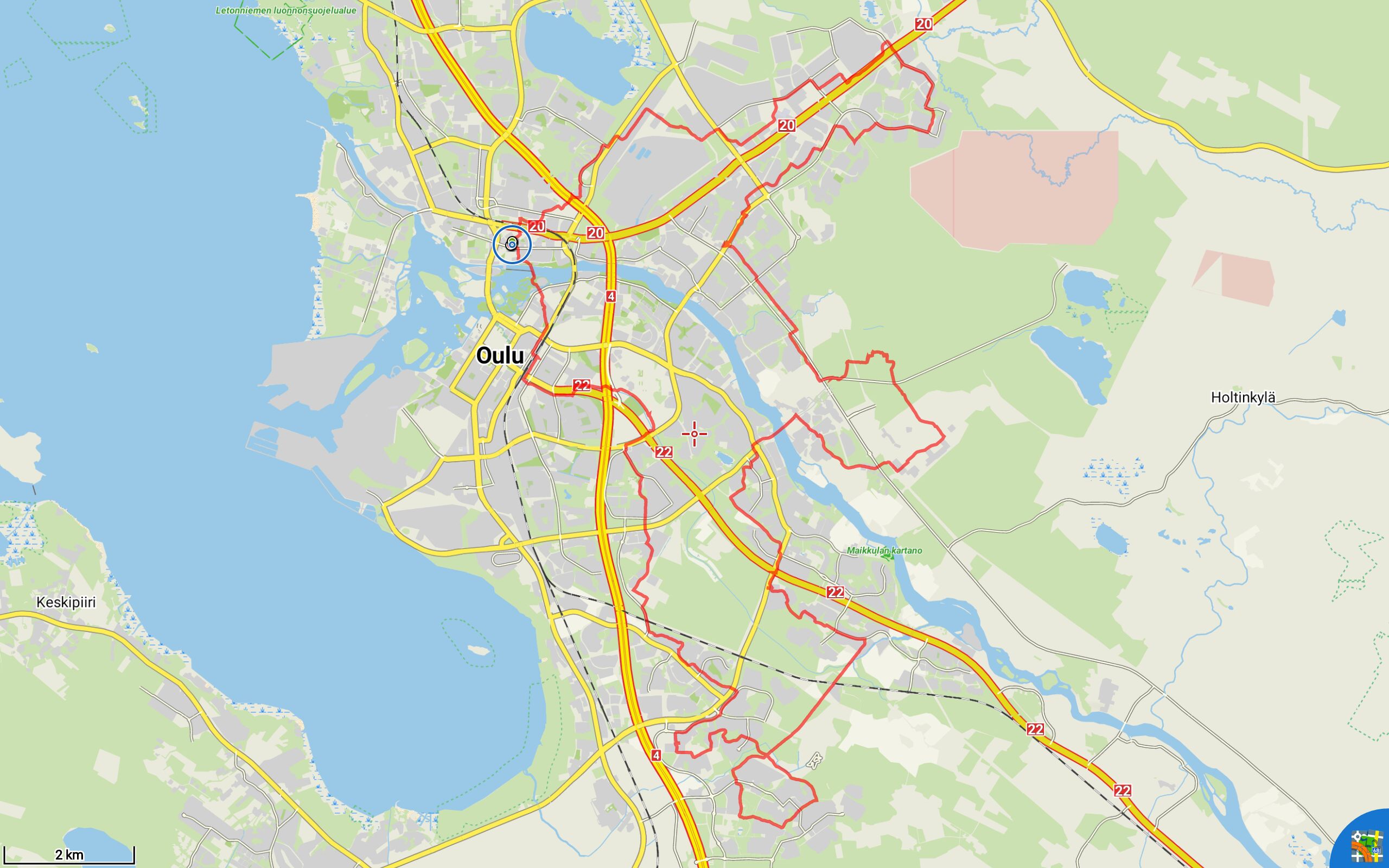 Hiukkavaarataloa ihmetellessäni saan 20 kilometriä täyteen. Minimitavoite on siten saavutettu, eikä kävely tunnu vielä missään. Siten on luontevaa ottaa suunta kohti tavoitteen seuraavaa tasoa, kolmeakymmentä kilometriä. Jatkan Saarelan kautta kohti Poikkimaantiensiltaa, jota myöten ylitän Oulujoen. Asetan reittini seuraavaksi kiintopisteeksi Neste Oulun Baarin, jossa suunnittelen pitäväni kahvitauon. Varmaan sieltä saa myös rähmäpullia (Berliininmunkkeja).