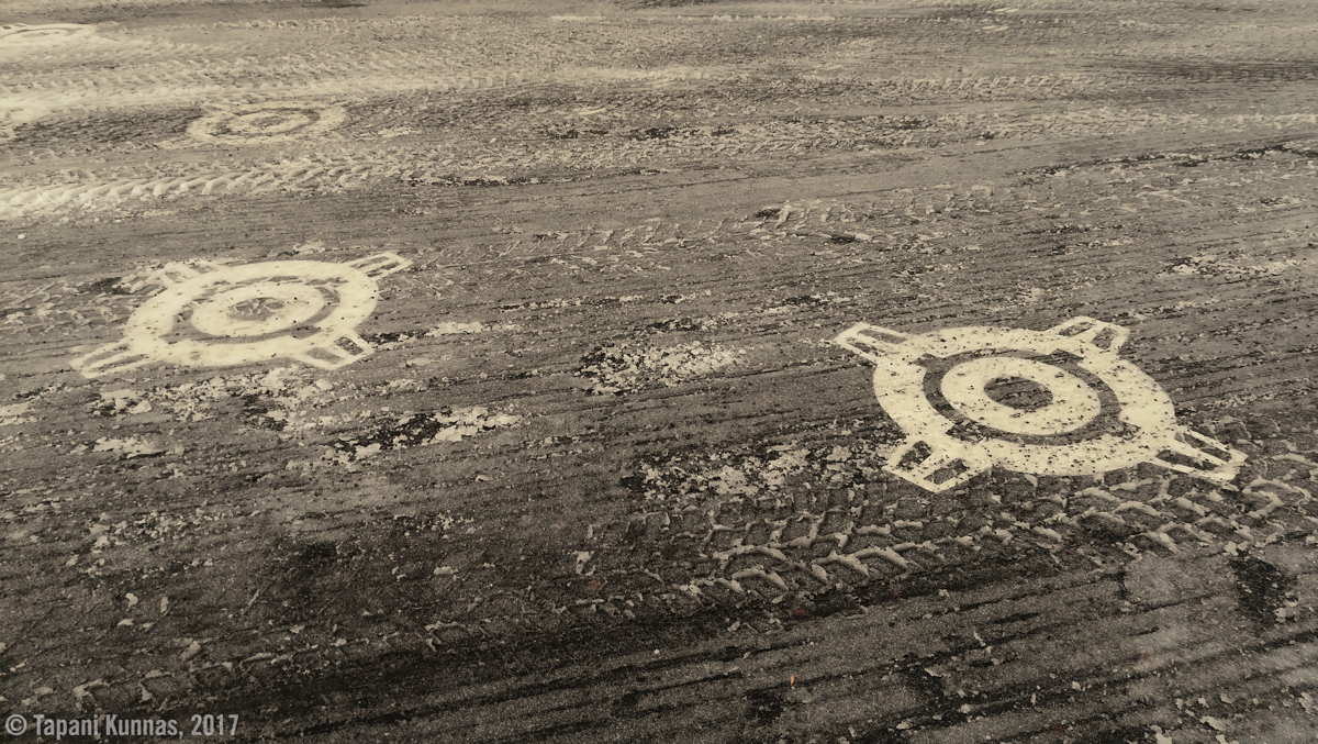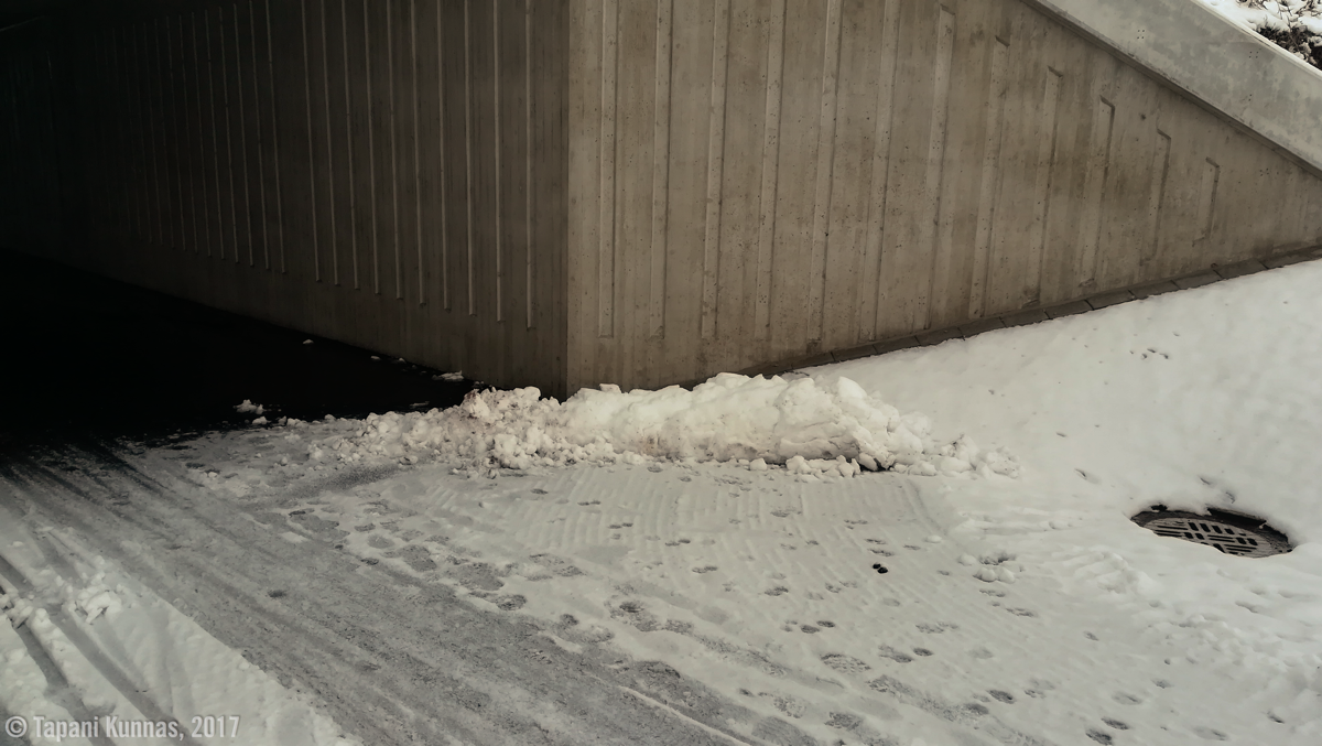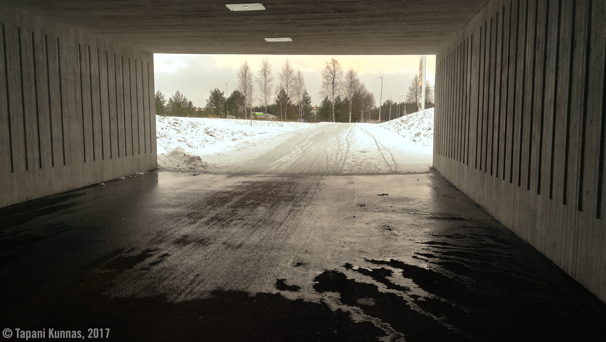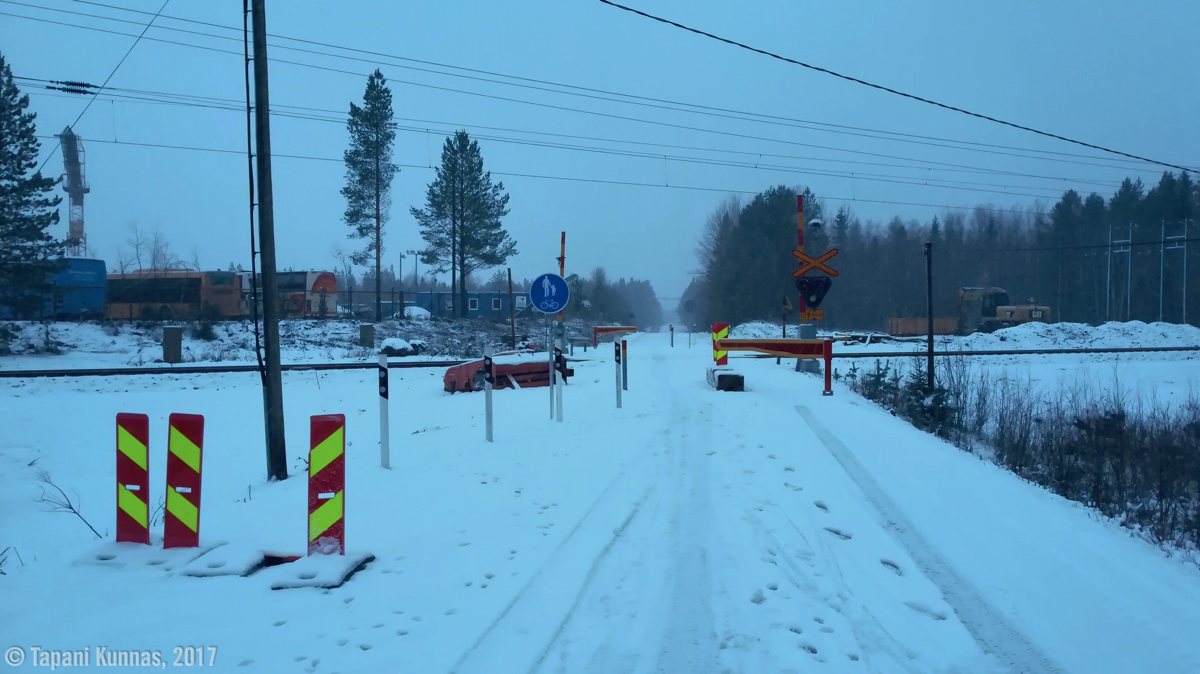 Iinatintien pitkää suoraa kävellessäni alkaa sataa lunta. Tämä vajaan kolmen kilometrin pituinen suora on päivän ainoa osuus, jonka aikana en näe ainuttakaan ihmistä. Ennen tämä tie oli paljon käytetty läpikulkuväylä Kaakkurin ja Iinatin välillä, mutta nyt siitä ei autolla pääse enää ollenkaan, sillä kohtaan, jossa tie ylittää radan, on asennettu ajoesteitä ja tie kavennettu sellaiseksi, ettei siitä autolla mahdu. En ihan ymmärrä tämän tarpeellisuutta. Olisiko muutoksella haluttu poistaa käytöstä yksi potentiaalisesti vaarallinen tasoristeys? Ei tunnu uskottavalta, koska ensinnäkin tämä tasoristeys on varustettu varoituslaitteilla (valot ja puomit) ja onhan risteys muutoksen jälkeenkin vielä (kevyen liikenteen) käytössä. No, enpä minä kaikkia muitakaan Oulun liikenneväyläsuunnittelun tuotoksia ymmärrä.