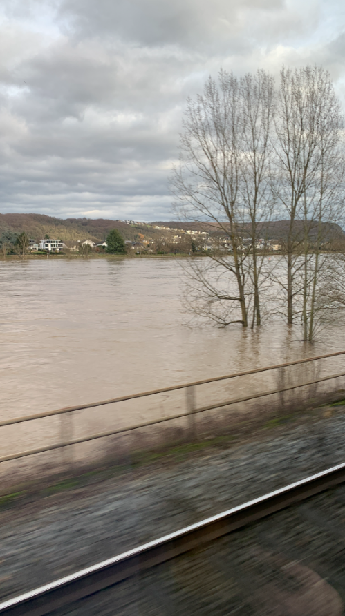 Kölnistä matka jatkuu Rein-joen vartta seuraillen Bonnin kautta Koblenziin, jossa on seuraava junanvaihto. Myös täällä näkyy, että viime aikoina on satanut runsaasti – Reinissä on vettä reippaasti enemmän kuin uomaan kohtuudella mahtuisi.