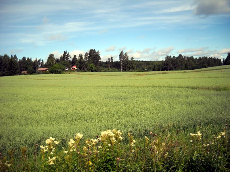 Kesä on jo pitkällä, ja kaurapeltokin melkein lainehtii. Toisaalta kesää on myös vielä paljon jäljellä, koska vilja on vielä vihreää eikä siten lähellekään korjuukypsää.