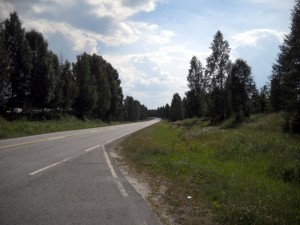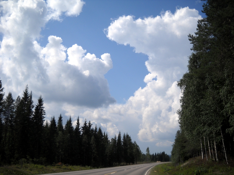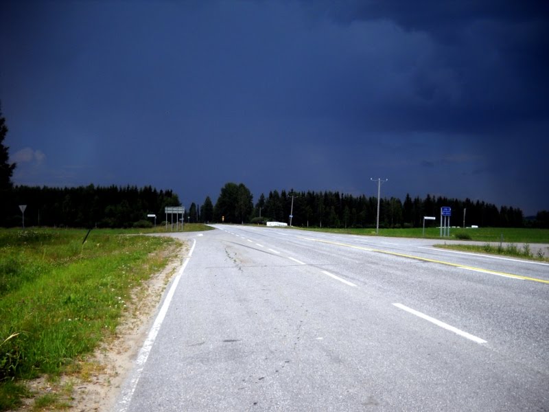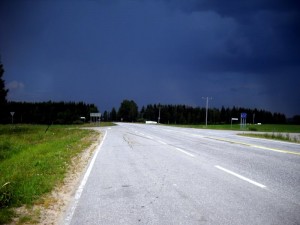 Lieksasta lähdettyäni en sitten enää onnistunut väistelemään sateita, vaan pääsin välillä ihan kunnon ukkossateen alle. Siitä selvittyä oli hyvä ottaa kuva taaksepäin, millaisen sateen läpi oli tullut ajetuksi.