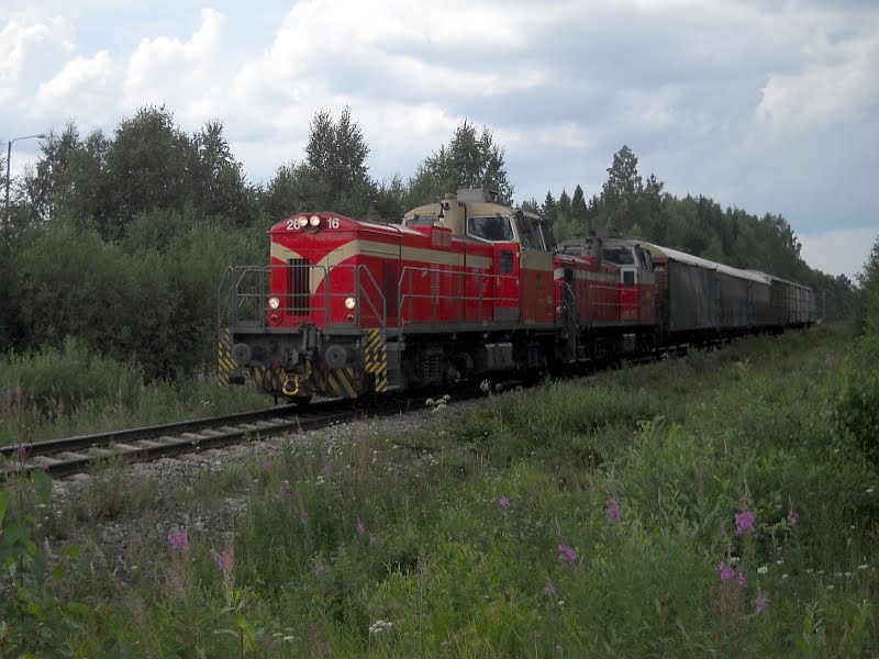 Hieman myöhemmin sain kuvattua nämä samat veturit uudelleen, kun edellisessä kuvassa kameraa kohti tuleva kone oli valjastettu asemalla odottaneen junan keulille, ja veturit toivat pätkäjunan parivedolla Uimaharjun ohi, kenties Joensuuhun oli matka.
