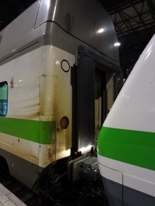 Harmitti hiukan, kun en ehtinyt tarpeeksi lähelle saadakseni hyvän kuvan. Mutta ei hätä ollut tämän näköinen: kohta vaunut pakitettiin raiteella 3 odottaneeseen runkoon kiinni. Nythän tämä meni mielenkiintoiseksi. En ollutkaan tätä ennen nähnyt, että junassa olisi kaksi ravintolavaunua tällä tavoin peräkkäin. Vaunuista veturin puoleinen pysyi pimeänä, mutta toiseen meni henkilökuntaa sisälle. Rungossa ei ravintolavaunua muualla ollutkaan, joten minun teoriani – jota en pysty vahvistamaan – on, että junassa olisi ollut pohjoisesta tullessa Rkt 23825, joka olisi ollut epäkuntoinen, ja sen vuoksi Oulussa olisi otettu kyytiin toimiva Rkt 23840. 23825 otettiin sitten kyytiin ja vietiin etelään pajalle. Mutta tämä siis on vain arvailua.