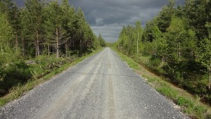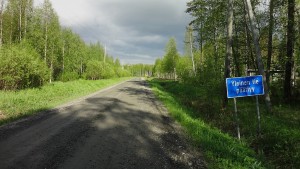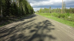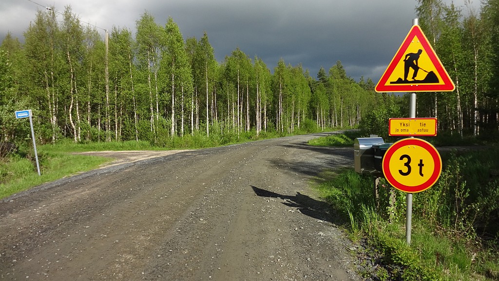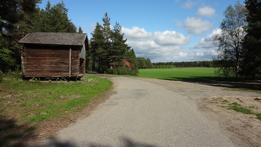 Tämä osuus oli etukäteen arveluttanut – näin pientä tietä ei Googlen katunäkymässäkään ole, joten en voinut etukäteen varmistua tien laadusta. Olin henkisesti valmistautunut kääntymään takaisin, jos tie alkaisi näyttää kovin huonolta. Ihan hyvähän tuo tie kuitenkin oli, vaikka irtosoraa olikin paljon. Autoliikenne oli kuluttanut tiehen sellaiset urat, joita saattoi hyvin ajaa tuollaista 30-40 km/h vauhtia. Vain yhdessä kohtaa oli tie pettänyt siihen malliin, että henkilöautolla siitä olisi jo ollut vähän hankala mennä, ja kuorma-autolla olisi ehkä jäänyt menemättä. Mutta minun mopedillani siitäkin pääsi hyvin.