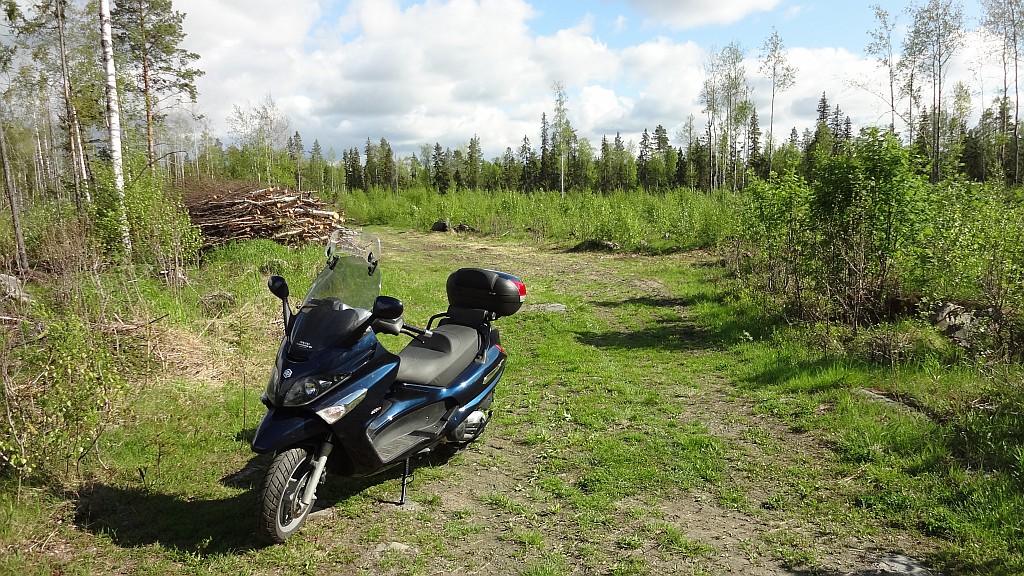 Tästä sitten alkaa oikea maaseutu, eli kestopäällyste päättyy. Jatkoin tästä vielä vähän matkaa eteenpäin, mutta ajoneuvoni vaatimaton maastokelpoisuus sekä mielessä olevat muut retkikohteet samalle päivälle antoivat syyn kääntyä takaisin hyvissä ajoin ennen rautatietä. Lapsuudessa ajelin pyörällä paljon noissa Suokkosen takaisissa metsissä käyden usein radan takanakin.