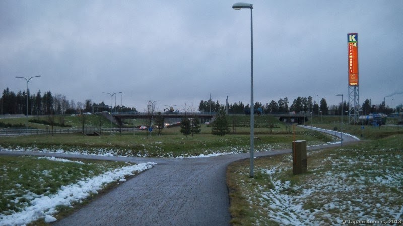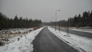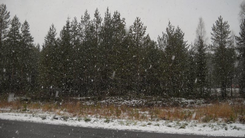 Onneksi salaattipöydän antimet sentään ovat hyviä. Muuten harmittaisi jo liikaa. Syötyäni lähden matkaan. Samalla alkaa sataa lunta. Panen merkille, että maa on jo valmiiksi paljon valkoisempi kuin kaupungissa. Olen tämän aiemminkin huomannut: meren lämmittävä vaikutus ei ulotu kovin kauas rannikolta. Kuljen koko matkan Kuusamontietä eli valtatietä 20 seuraillen – enimmäkseen aivan tien vieressä menevää kevyen liikenteen väylää pitkin, ja välillä hiukan kauempaa koukaten, mutta en missään kohdassa käy muutamaa sataa metriä kauempana isosta tiestä.