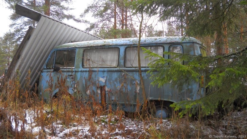 Kuva on otettu marraskuussa 2013. Tarkkaa paikkaa en nyt kykene muistamaan, mutta jossain Kiimingin ja Hönttämäen välillä se muistaakseni oli. Isolta tieltä oikealle katsottaessa näkyi se parempikuntoinen kone ja raato oli tien toisella puolella, metsän reunassa.
