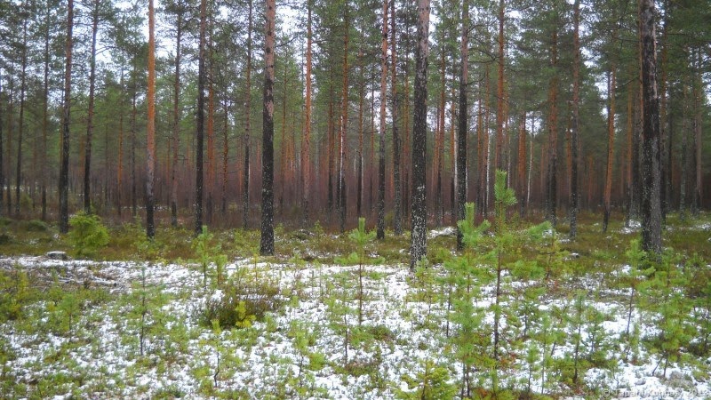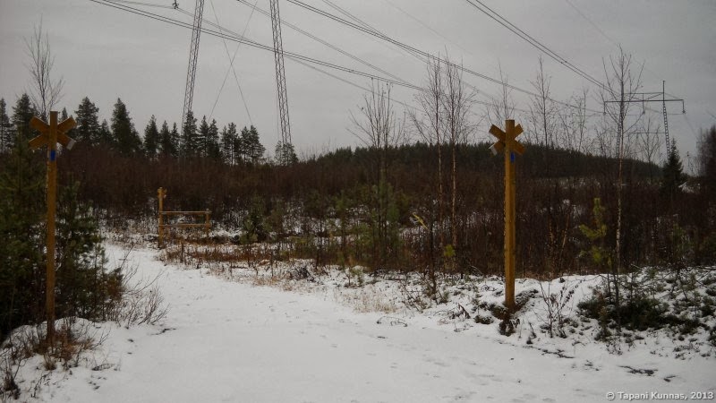 Ennen Jääliä alitan ison sähkölinjan, joka kulkee tästä suoraan etelään. Aikomukseni on joskus talvella ottaa metsäsukset ja hiihtää tästä sähkölinjaa seuraillen aina Oulujoelle asti. Sinne tulee matkaa noin 20 kilometriä, ja vain parissa kohdassa on tarpeen poiketa linjalta – Sanginjoen ja Pilpaojan ylitykset täytyy tehdä siltoja myöten vähän sivummalta.