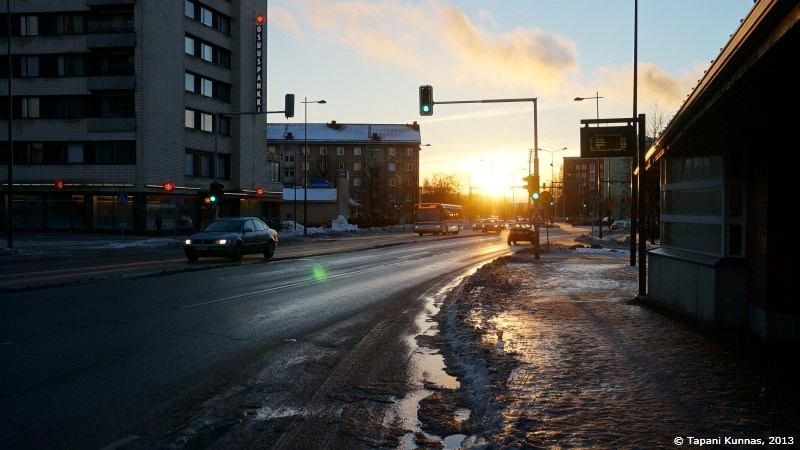 Merikoskenkadun pysäkillä bussia odottaessani aurinko paistaa vielä.