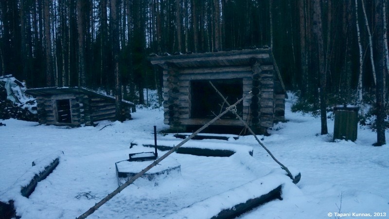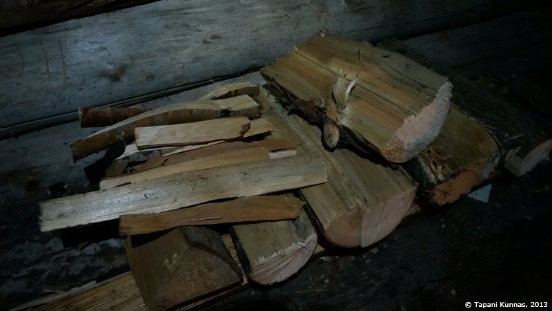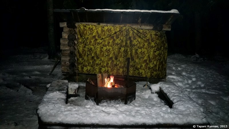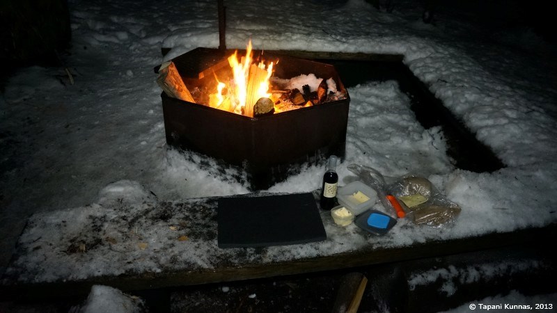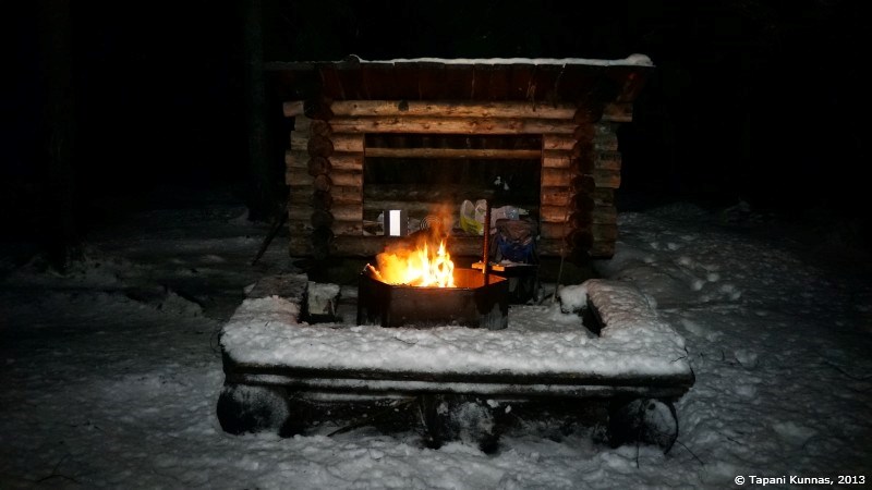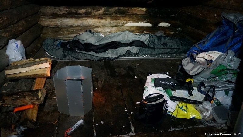 Polttopuuvarasto on täynnä ja puut ovat oviaukon lähellä olevia lukuun ottamatta ilmeisen hyvin kuivuneita. Valitsen pari teräväsärmäistä klapia, joista rupean lohkomaan syttyjä. Kasaan niistä pienen keon, jonka keskelle asetan yhden sytytyspalan, ja tuikkaan siihen tulen tulitikulla. Nuotioni syttyy ensi yrittämällä. Jatkan puiden lohkomista ja teen vähitellen isompia palasia, joita lisäilen nuotioon sitä mukaa kuin tuli voimistuu. Eikä aikaakaan, kun minulla on jo komea, mukavasti valoa ja lämpöä antava iltanuotio. Viritän myös retkikeittimeni, jossa kokeilen polttoaineena tällä kertaa pieniä tuikkukynttilöitä. Haluan tietää, riittääkö niiden teho lumen sulattamiseen. Täytän kattilani tiiviisti lumella ja asetan sen kahden kynttilän lämpöön. Tuulisuojus ympärille ja kansi päälle, jolloin lämpöä ei mene harakoille.