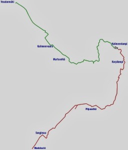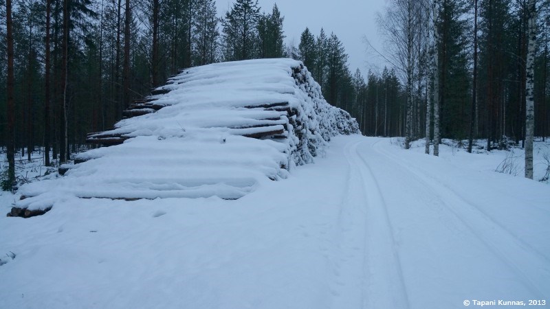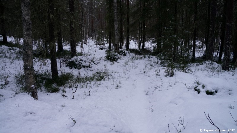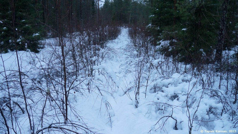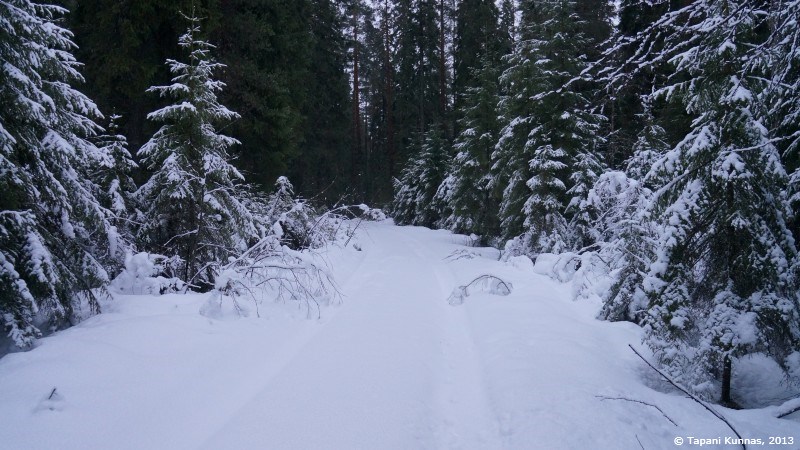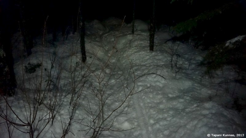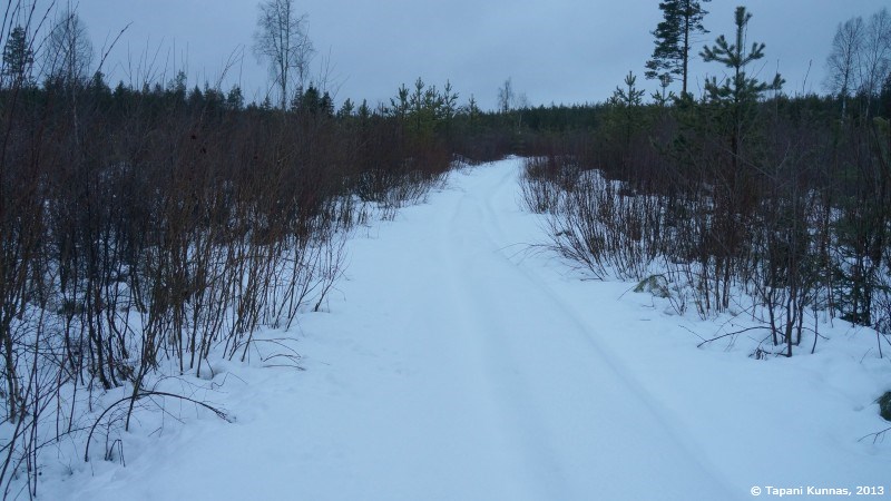 Kuvan otettuani ja nuudeli-soijarouhe –päivällisen syötyäni jatkan taas matkaa. Aikomukseni on kävellä polkua pitkin parisataa metriä ja sitten suunnistaa pimeän metsän läpi seuraavalle polulle. Suunnistamalla edettävä matka on kerrassaan sata metriä. Ei siis mikään varsinainen taidonnäyte, mutta on siinä se pieni lisähaaste, että kohteena oleva polku on lumen peitossa ja se on merkitty valkopäisin puupaaluin, joita ei ole kovin tiheässä. Saan siis katsella ympärilleni aika tarkasti löytääkseni etsimäni. Jos polku jää löytymättä, ei siitä aiheudu sen kummempaa vahinkoa – jatkan vain samaan suuntaan vielä puoli kilometriä, ja olen taas tiellä.