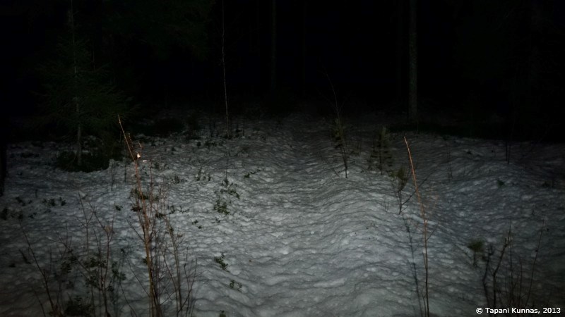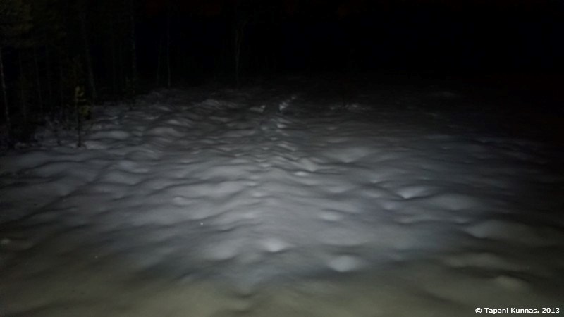 Liioittelin äsken vähän. Ei tuossa paikassa ole koskaan edes ”lähes täydellistä” pimeyttä, sillä puolentoista kilometrin päässä olevan tv-maston vilkkuvalot valaisevat maiseman kerran sekunnissa. Lunta on tosiaan paljon enemmän kuin olin odottanut: pitkosten vieressä sitä on jopa 40-50 sentin syvyydeltä. Olisinpa sittenkin ottanut lumikengät mukaan.