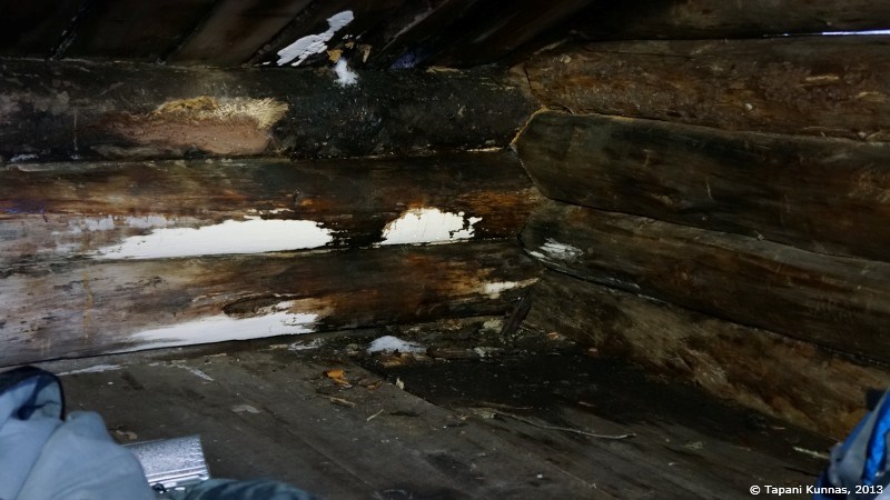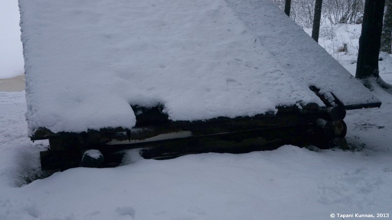 Tuplapussissa on lämmintä ja mukavaa, eikä unta tarvitse pitkään odotella. Yöllä heräilen muutamaan kertaan, kuten aina, mutta nukun silti kohtalaisen hyvin aina siihen saakka, kun alan palella. Hetkinen! Eihän tässä näin pitänyt käydä. Laitan lisää vaatetta päälle, mutta se ei muuta tilannetta. Sinnittelen kuitenkin puoli yhdeksään asti. Otan vaatteet ensin yksi kerrallaan hetkeksi makuupussiin lämpenemään ennen kuin puen ne päälleni. Laavussa tuntuu epämiellyttävän kylmältä, ja lampun sytytettyäni oivallan syyn: kosteus. Makuupussin ulkopinta on kostea, samoin kaikki tavarat, joita tarkastelen. Niin myös laavun seinät. Laavun takanurkka on märkä, ja myös makuupussin jalkopää on kastunut ihan kunnolla. Valon turvin tutkin nurkkaa tarkemmin, ja huomaan, että laavun katossa on reikä, ja katolla sulava lumi valuu tästä vetenä sisään. Perhana! Tämä olisi kyllä pitänyt illalla huomata. Tutkin tarkemmin myös laavun sisäpinnalla olevia suuria valkoisia alueita. Sientä. Pukeuduttuani menen tutkimaan laavua ulkopuolelta, ja totean, että parasta ennen –päivä on kyllä tämän laavun osalta jo reilusti takanapäin. Laavu on myös notkahtanut vinoon, minkä huomasin jo pian nukkumaanmenon jälkeen, kun jatkuvasti kylkeä kääntäessäni huomasin valuvani pois makuualustan päältä. Vasta sitten, kun asettelin illalla kuivaamiani polttopuita makuualustan viereen ”alarinteen” puolelle stoppareiksi, aloin pysyä paikallani. Tätä laavua ei kyllä voi suositella yöpymispaikaksi muuten kuin ehkä kuivana kesäyönä. Jos silloinkaan. Valitettavasti, sillä paikka sinänsä on hieno.