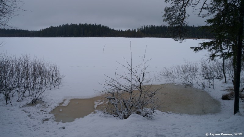 Lounaan jälkeen matka jatkuu tuttuja polkuja pitkin. Mitä pienemmäksi polku käy, sitä enemmän sillä on lunta. Olen taas Hirvikärpäspolulla, jota kutsun tällä nimellä syyskuisen retkeni kokemusten vuoksi. Kuljen jalansijani varovasti valiten, sillä muistan sulan maan ajalta, että polulla on paikoin isohkoja kuoppia. Vaellussauvalla voisi tietysti tunnustella, onko kuopissa vettä, mutta pakkasin sen jo edellisellä tauolla rinkkaan, enkä laiskuuttani viitsi ottaa sitä esille. Ei kai tässä niin märkää ole. Polku hupenee välillä lähes näkymättömiin, mutta tunnen tämän paikan jo niin hyvin, että muistan, missä polku menee. Lunta on polulla pari-kolmekymmentä senttiä, minkä lisäksi polun päälle taipuneista pikkuoksista tarttuu housuihini märkää lunta, joka tehokkaasti kastelee ne. Olen kohta yltä päältä märkä: alkumatkan jäljiltä paitani on märkä suunnilleen vyötäröstä kainaloihin, ja nyt tämän lumisen polun myötä olen märkä myös nilkoista puolireiteen. Tästä huolimatta minulla on kivaa. Mieleen juolahtaa, että voisin vallan hyvin istuskella kotona mukavassa tuolissani, juoda lämmintä glögiä ja syödä pipareita, mutta kyllä minä sittenkin olen mieluummin täällä. Jos edessä olisi toinen yö ulkona, voisin tosin olla toista mieltä.