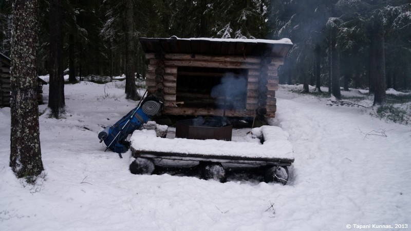 Lumipeitteen koskemattomuus tarkoittaa sitä, että ainakaan tältä suunnalta kukaan ei ole tänään mennyt laavulle. Perille päästyäni totean, ettei sielläkään näy ainuttakaan jalanjälkeä, joten olen varmuudella päivän ensimmäinen retkeilijä tällä laavulla. Hyvä näin. Toki ei olisi katastrofi, vaikka paikalla olisi muita: alueella on kohtuullisen matkan päässä niin monta laavua, että jos ensimmäinen olisi varattu, ehtisi saman illan aikana hyvinkin etsiä uuden yöpaikan.