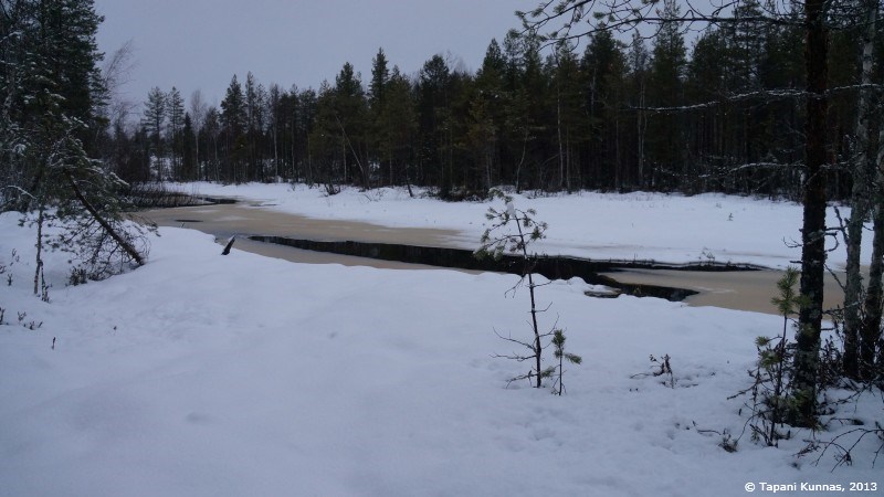 Jään bussin kyydistä Madekosken kohdalla. Vanhaan hyvään aikaan – vuoteen 1991 asti – tästä kuljettiin Oulujoen yli lossilla. Nyt paikalla on silta, mutta lossi ei ole kaukana. Se siirrettiin vain seitsemän kilometrin päähän, Pikkaralaan, jossa se on käytössä edelleen – tosin vain sulan veden aikaan. Ylitän myös Sanginjoen, ja sitten lähden Sanginjokivartta pitkin ylöspäin eli koilliseen. Sankivaaran golfkenttä ulottuu tänne asti, mutta onneksi lumi peittää sen. En voi käsittää, miksi näitä golfkenttiä pitää rakentaa aina juuri maisemallisesti arvokkaisiin paikkoihin, kuten tänne tai Virpiniemeen. Tässäkin on pilattu kolme kilometriä kaunista jokivarren maisemaa.