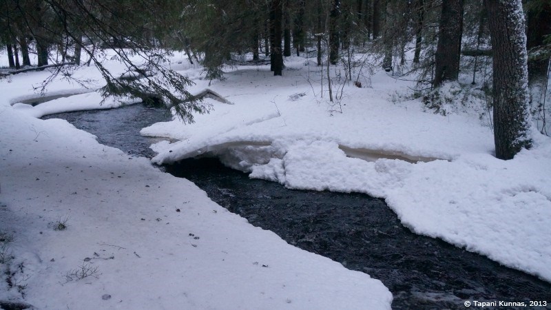 Yöllä on satanut lunta sen verran, että puiden oksistot ovat lumen peitossa. Mutta lämpötila on taas reilusti plussan puolella, mikä tarkoittaa, että tuo lumi sulaa ja tippuu vetenä alas. Mikä edelleen tarkoittaa, että kun kuljen kapeaa polkua pitkin, vettä tippuu myös minun päälleni, eikä kestä aikaakaan, kun takkini on kauttaaltaan märkä. Rinkkani kokee saman kohtalon. Olisi minulla siihen sadesuoja, mutta en saa sitä paikalleen, kun olen kiinnittänyt makuualustakäärön rinkan yläpuolelle. Hummel-takkini, jonka pitäisi olla vedenpitävä, ei sitä täysin ole. Jostain pääsee vettä oikean kainaloni alle, ja kohta koko kylki on märkä. Sadetakin jätin ajattelemattomuuksissani kotiin. Myllykosken laavulle päästyäni huomaan tehneeni varsinaisen emämunauksen: taukotakkini, jonka olen kiinnittänyt rinkan ulkopuolelle, on läpimärkä. Kaikilla aikaisemmilla retkilläni olen pakannut sen rinkan sisälle, mutta nyt siellä ei ollut tilaa, kiitos kahden makuupussin. Typerintä tässä on, että en ole suojannut takkia muovikassilla, vaikka rinkassani olisi yksi ylimääräinen aivan joutilaana. Näitä talviretkiä tosiaan kannattaa tehdä tällaisina lyhyinä, yhden yön mittaisina, jolloin tällaisistakaan pöljyyksistä ei joudu kohtuuttomasti kärsimään. Kyllä tässä tyhmää taas opetetaan.