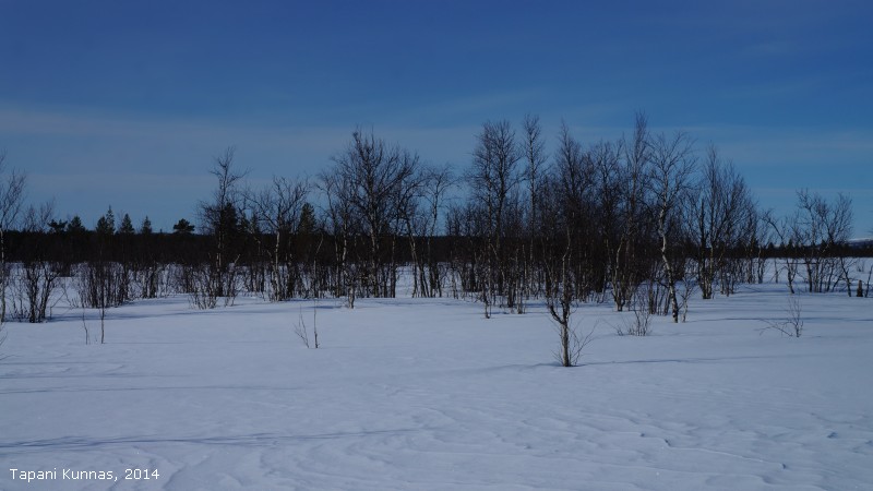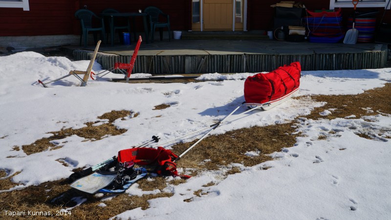 Harjoitusretki on nyt tehty ja on tositoimien aika. On toukokuun neljäs päivä armon vuonna kaksituhattaneljätoista. Olen eilen käynyt hiihtoretkellä Hetan pohjoispuolisissa maastoissa tutustuakseni paikallisiin olosuhteisiin ja voidakseni päättää, lähdenkö tälle pitkälle retkelleni suksilla vai lumikengillä. Hanget osoittautuivat niin koviksi, että suksilla latujen ulkopuolella liikuttaessa sivuttaispito on olematon, mikä tekee kulkemisen tarpeettoman hankalaksi. Tälle pitkälle retkelle otan tavarat mukaan ahkiossa, jonka kiskominen vaatii kohtalaisesti kitkaa jalkojen alle. Siksikin sukset eivät ole näissä oloissa hyvä ratkaisu. Nousukarvoilla tilanne olisi korjattavissa, mutta sellaisia en omista, enkä vain tätä yhtä retkeä varten ruvennut niitä hankkimaan. Siispä lumikengillä matkaan.