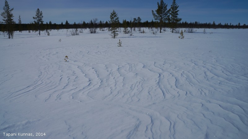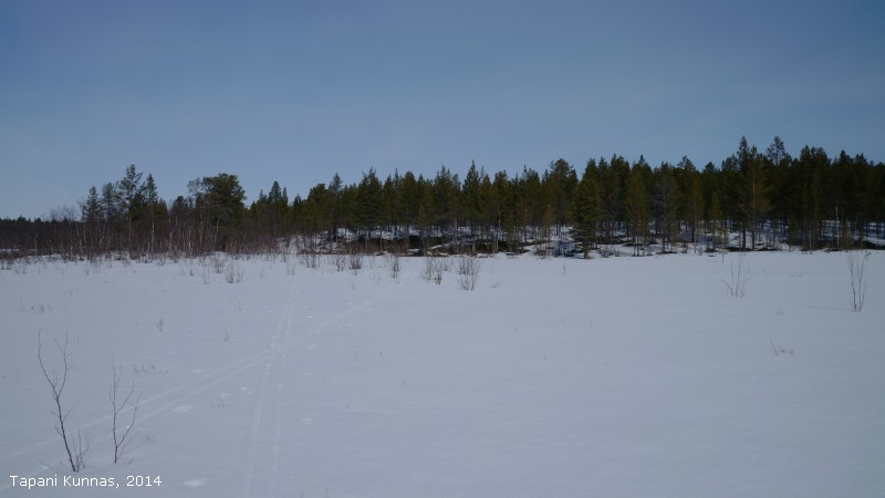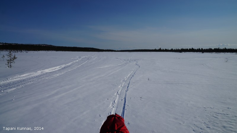 Pahtakuru on tänään hiukan erilainen kuljettava kuin eilen: nyt ei tarvitse temmeltää pitkien suksien kanssa, mutta perässä oleva pulkka asettaa omat rajoituksensa etenemisreitin valinnalle. Nopeasti kuitenkin opin lukemaan maastoa eteenpäin usean kymmenen metrin päähän, enkä joudu kertaakaan niin tukkoiseen paikkaan, että joutuisin varsinaisesti peruuttamaan. Pari kertaa ahkio oikaisee niin läheltä puita, että ohut oksa kiilautuu vetoaisan kiinnityskohtaan, ja joudun irrottautumaan vetovaljaista ja selvittämään ahkion irti.