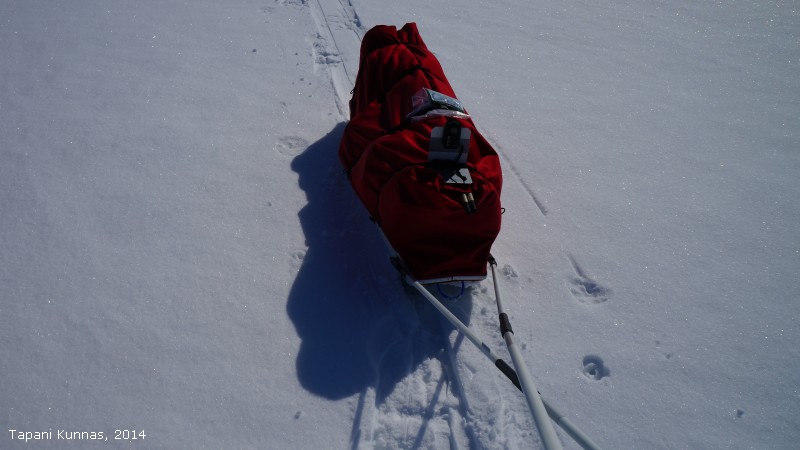 Onhan siinä vetämistä, mutta jäisellä hangella tällainen kuorma tulee perässä helposti. Minulla on ahkion vetovyössä myös valjaat eli henkselit, jotka ovat ensisijaisesti sitä varten, että saan kameralaukun niihin roikkumaan ja kamera on tällöin mukavasti käden ulottuvilla, mutta ei kuitenkaan tiellä. Valjaista on oleva myöhemmin tällä retkellä hyötyä myös ahkion vetämisessä, kun innostun menemään tasamaan ulkopuolelle.
