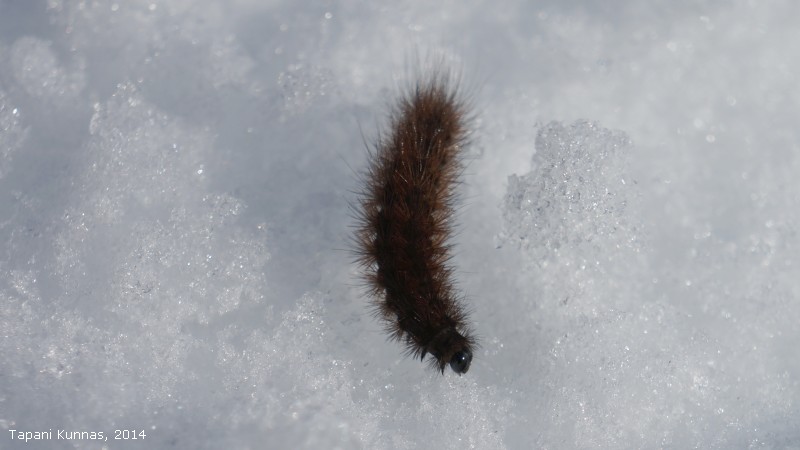 Tauon päätteeksi löydän lumelta ahkioni vierestä pienen toukan – ilmeisesti kyseessä on ruostesiiven toukka. ”Ruostesiiven toukat lähtevät liikkeelle varhain keväällä, maalis-huhtikuussa, jo ennen lumien sulamista. Kookas, tumma ja karvainen toukka on helppo havaita keväthangelta.”, kertoo Wikipedia. Otan siitä kuvia, minkä jälkeen matka jatkuu yli pienen kannaksen, joka erottaa Pahtakurun pohjoispääksi mieltämäni suoalueen seuraavasta suoalueesta, Pahtakurunjänkästä. Varon kompastumasta kannaksen poikki menevään korkeuskäyrään ja kun saan näkyviin edessäni avautuvan maiseman, olen silmäni tiputtaa. Enpä arvannut, että vain parinkymmenen metrin päässä eilisen retkeni kääntöpisteestä olisi näin upeat näkymät! Aukeaa suota on edessäni parin kilometrin verran juuri kulkusuuntaani pohjoiskoilliseen. Jossain kaukana näkyy korkean tunturin lumivalkoinen laki. En tiedä, mikä tunturi on kyseessä, mutta hienolta se näyttää. Jierstivaara olisi ilmeisesti alueen korkein huippu, ja se on oikeassa suunnassa. Se kohoaa 645,8 metrin korkeuteen ja on siinä mielessä erityinen paikka, että se on osa Struven ketjua.