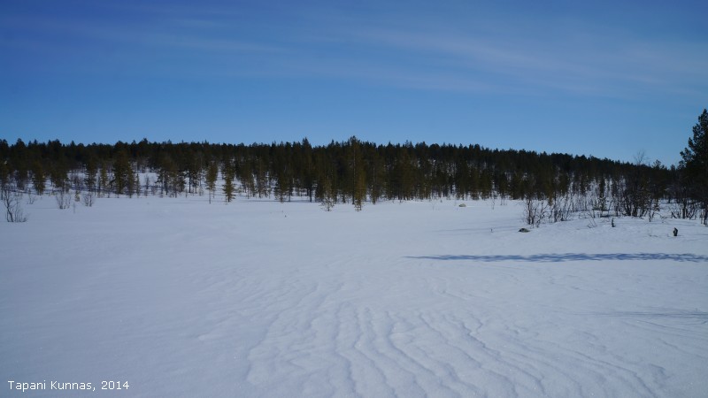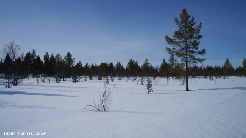 Kuljen eiliseltä tutuksi tullutta reittiä ja pidän lounastauon samassa paikassa kuin eilen. Peipponen visertää vieressä. Taivas on vielä pilvettömämpi kuin eilen, joten aurinko pääsee esteettä lämmittämään. Se ja raskaampi kuorma saavat hikoilemaan, ja olen vähentänyt vaatetusta jo ennen lounastaukoa. Pohjoistuuli puhaltaa tänäänkin kylmästi, joten aivan minimiin ei voi vaatetta vähentää – tuulta pitävä takki on hyvä jättää päälle, ja pitkähihainen paita sen alle.
