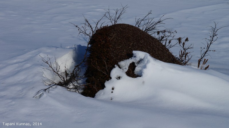 Muuten tasaisesta lumilakeudesta pilkistää siellä täällä muurahaispesiä. Murkut ovat vielä talvihorroksessa, tai jos ovat heränneet, niin eivät ole vielä kuitenkaan uskaltautuneet ulos. Eipä täällä niille ravintoa olisikaan.