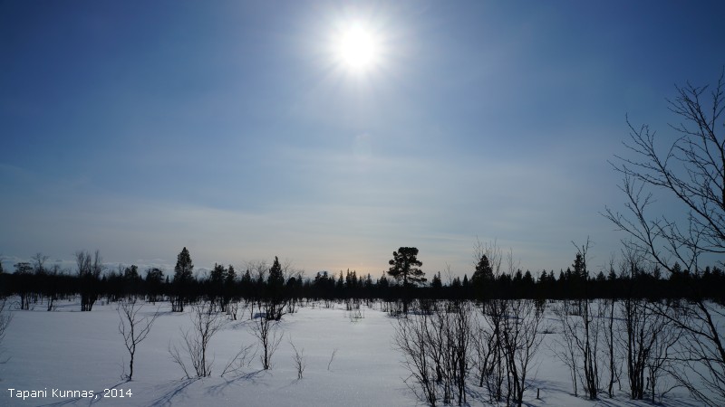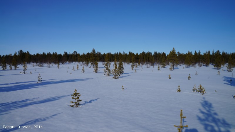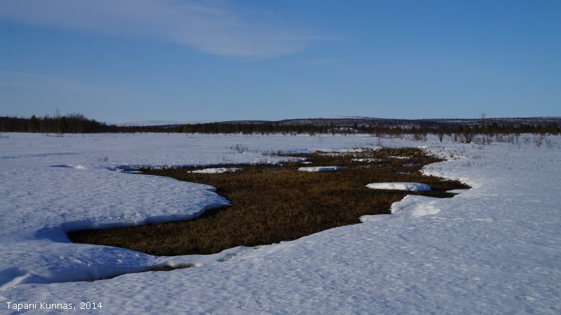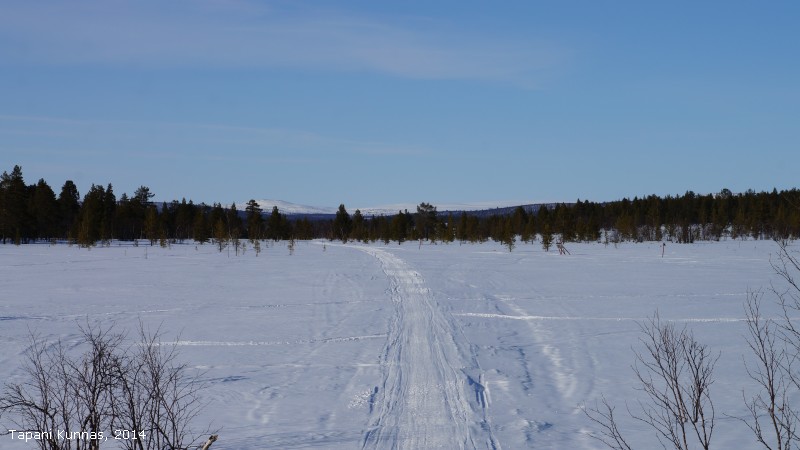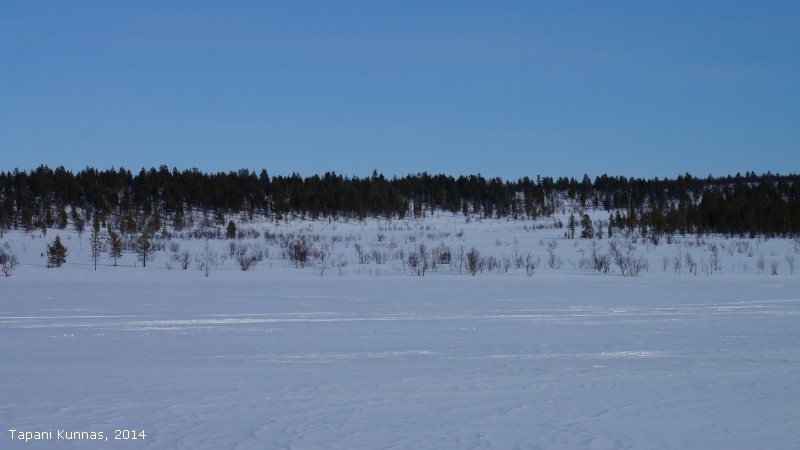 Katselen oikealla kohoavia Sissankiselän ja Selänpään rinteitä. Jossain tuolla ylempänä kulkee retkeilyreitti Hetasta Näkkälään – sitä voisi kulkea, jos tänne joskus tulisi sulan maan aikaan. Olisihan se myös mielenkiintoista nähdä, miten erilaiselta nämä suolakeudet näyttäisivät ilman lumipeitettä.