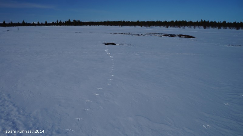 Tutkin karttaa ja päätän kiertää Hormajärven länsipuolelta. Sehän on toki vielä jäässä – ehkä paksussakin – mutta en tunne oloani mukavaksi kulkiessani pitkin jäätä, jonka paksuutta en tunne. Lumella on isoja ”harakanvarpaita”, jotka eivät ole harakan, vaan kurjen jälkiä. Muutaman kurjen olen tänäänkin nähnyt, mutta vain matkan päästä – ne ovat niin arkoja lintuja, että lähtevät varmasti karkuun hyvissä ajoin ennen kuin haahuilija pääsee lähelle. Ahkio pitää jäisellä lumella niin kovaa ääntä, että karkuun minäkin lähtisin.