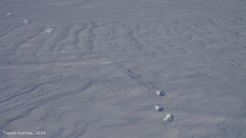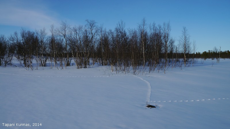 Seuraavaan vähän metsäisempään kohtaan saavuttuani katson taaksepäin, ja huomaan, että vaikka toisin oli tarkoitus, olen tullut juuri keskeltä Hormajärveä suoraan sen halki. Hups. Näen lumella poron jäljet – ne näyttävät hyvin tuoreilta, ja niistä näkee poron ottaneen yhdessä kohtaa 3-4 metrin mittaisen loikan eteenpäin ja sen jälkeen jatkaneen matkaa pitemmänpuoleisin askelin. Voisin kuvitella, että se on tuossa kohdassa saanut vainun lähestyvästä haahuilijasta, ja päättänyt aloittaa paikalta poistumisensa puolivauhkolla loikalla, kuten poroilla toisinaan on tapana liikkeelle lähteä.