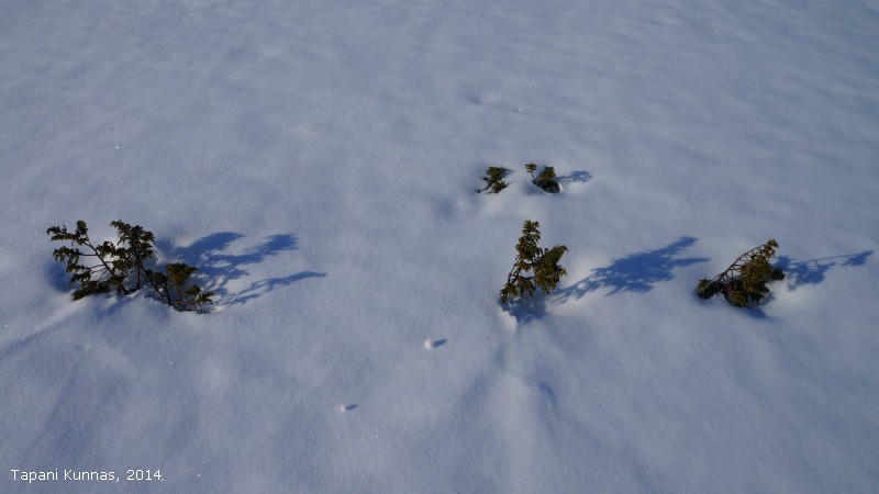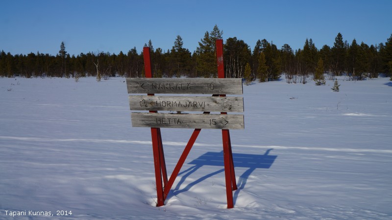 Näkkälä 10, Hetta 15. Näin lukee moottorikelkkareittien tienviitoissa. Tästä on Hettaan linnuntietä vain yhdeksän kilometriä, joten melkoisen mutkan tuo kelkkareitti tekee. Varjot alkavat olla jo pitkiä, joten voisin ruveta katselemaan yöpymispaikkaa. Haluan löytää sellaisen paikan, joka tarjoaisi riittävästi sekä tuulen- että näkösuojaa. En kuitenkaan halua mennä kovin kauas reitiltäni. Selänpäänjänkällä on muutamia saajoja, jotka voisivat soveltua tarkoitukseen. Löydänkin yhden, joka on jo melkein hyvä – se on kuitenkin vain sadan metrin päässä kelkkareitistä, eli liian lähellä. Jatkan vielä vähän edemmäs, ja löydän kuin löydänkin oikein mukavan näköisen paikan. Tähän pystytän leirini.