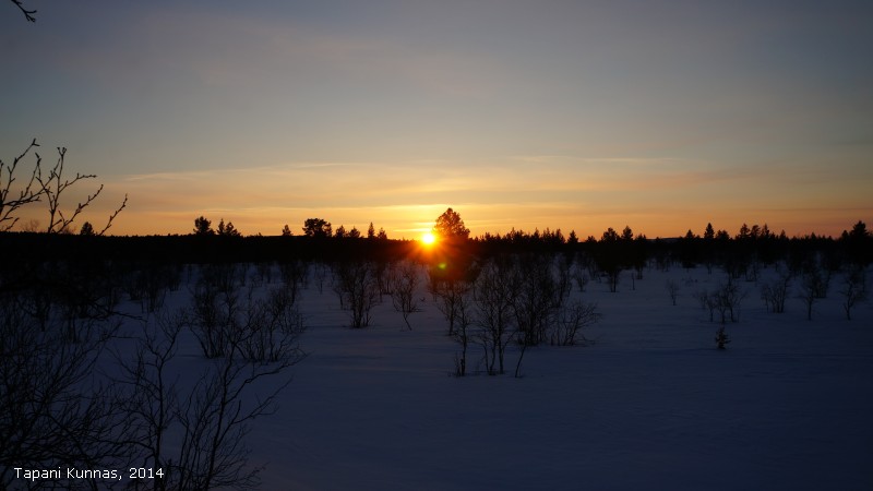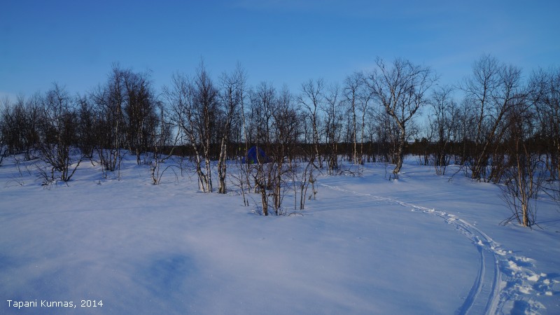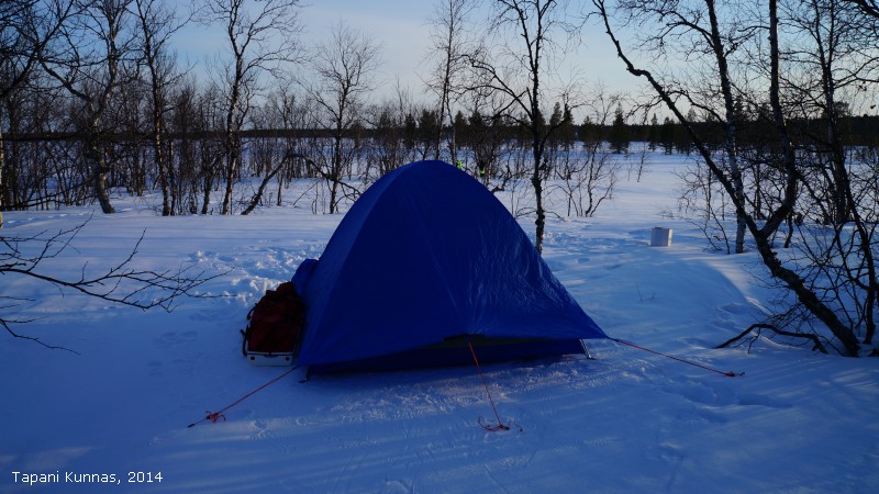 Olen edennyt päivän aikana runsaan kilometrin kauemmas kuin mitä aamulla keskinvauhdin perusteella arvelin. Yöpaikkani on riittävän kaukana kelkkareitistä ja saan telttani sillä tavoin puiden taakse, että vaikka joku kelkkailija nyt tähän suuntaan katsoisikin, tuskin leiriäni havaitsisi. Teltan pystytettyäni käyn tavanomaisiin iltatoimiin: vien makuualustan telttaan pullistumaan, otan kattilan täyteen lunta, ja sytytän keittimeen tulen sen sulattamiseksi. Näin illalla kun laittaa termospullon täyteen kuumaa vettä, on se vielä aamulla riittävän lämmintä hampaiden pesemistä varten ja pienellä lisälämmityksellä siitä saa nopeasti puuro- ja kahviveden.