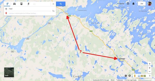 Reittihakuun piti laittaa lähtö- ja päätepisteeksi ”Hotelli Inari”, koska pelkkä ”Inari” sijoittuu Googlen mielestä noin kuudentoista kilometrin päähän Inarista Ivalon suuntaan.