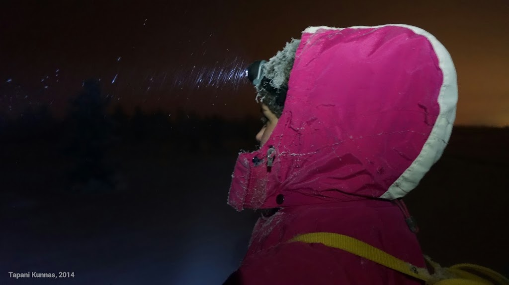 Lopulta päädymme suolle, joka näyttää melkein siltä kuin pitäisi, mutta ei aivan. Lisäksi on alkanut sataa lunta – sellaista hyvin tiheää pakkaslunta, josta ei maahan kerry juuri mitään, mutta joka tehokkaasti kutistaa näkyvyyden otsalampun valossa muutamaan metriin. Pysähdymme syömään eväitä ja tauon aikana teen päätöksen kääntyä takaisin. Olemme ennen retkeä sopineet, että viimeistään kuudelta käännymme takaisin riippumatta siitä, missä olemme, ja kello on jo kahtakymmentä vaille. Siis paluumatkalle.