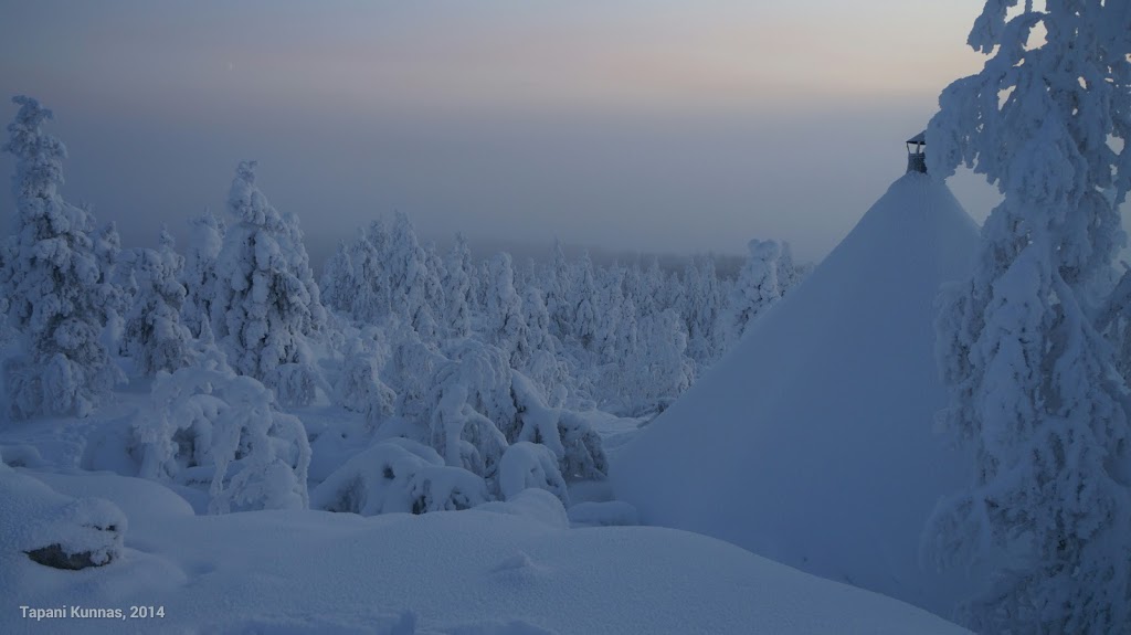 TSL:n lumikengissä on hyvä kantapään korotusrauta, jolla jalan asennon saa jyrkissä nousuissa mukavammaksi. Ominaisuus on hyödyllinen nousun jyrkimmässä osassa. Huipulla oleva masto on paksun kuuran peitossa. Sen lähelle ei kannata mennä, koska mastosta voisi pudota jäätä. Menemme siis suoraan laavulle, jossa pidämme ruokailun mittaisen tauon. Laavulla on kuivia polttopuita, ja sytytän pienen nuotion. Ei se paljon lämmitä, mutta ihan tunnelman vuoksi. Pakkanen on täällä ylhäällä maltillisissa lukemissa: vain 22 astetta.