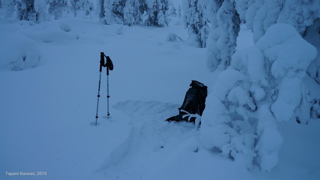 Vaellussauvan tekemä kolo. Puoli metriä pehmeää lunta ja sen alla vielä parikymmentä senttiä korkea onkalo.