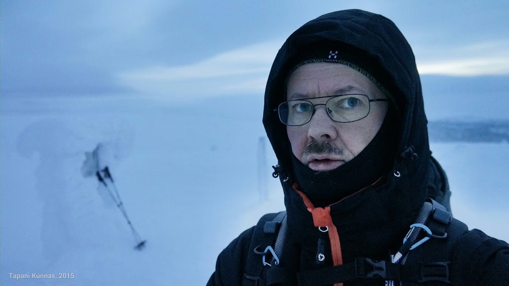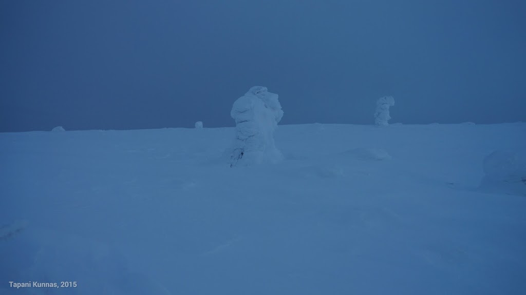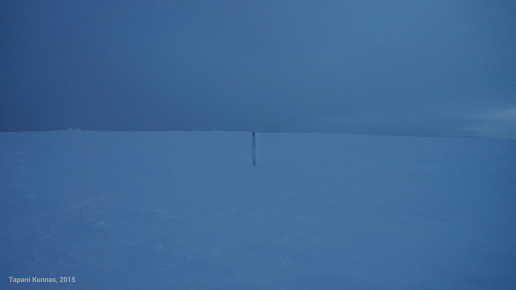 Satunnainen haahuilija Iisakkipään huipulla. Taustalla näkyy retkeilypolkujen risteyskohdan opastaulu, joka tosin oli niin paksussa jäässä, ettei siitä saanut mitään selvää.