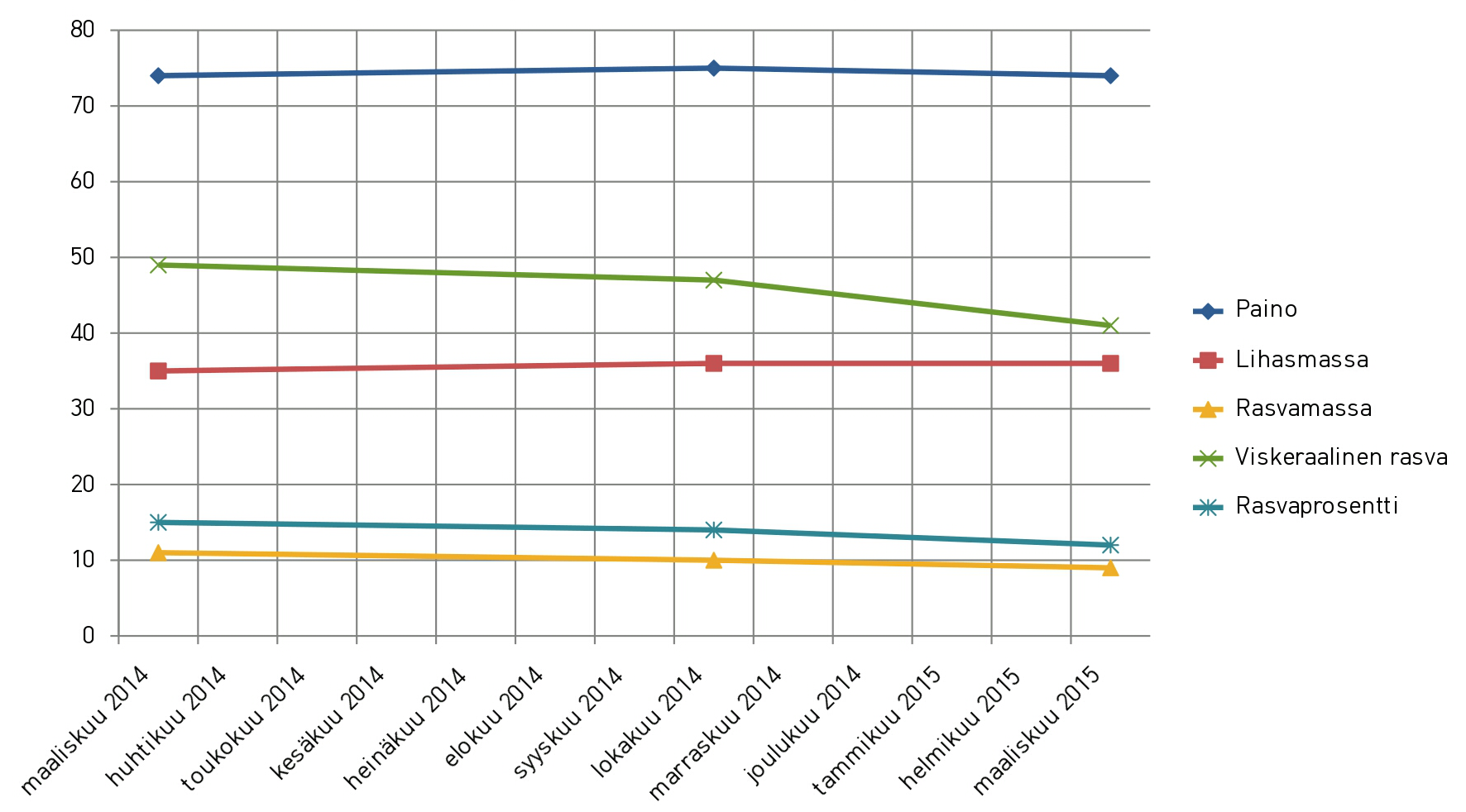 22.11.2014 aloitin ylenmääräisen sokerin välttelyn. Kirjoitin siitä lähtien blogiini väliraportteja otsikolla ”ei lisättyä sokeria”. Tavoitteena oli jättää kaikki, tai ainakin mahdollisimman suuri osa lisättyä sokeria sisältävistä ruuista pois. Tämä tarkoitti mm. makeisten, pullan, valmiiden marjajugurttien ja -rahkojen torjumista ainakin maaliskuuhun 2015 saakka. Silloin kun on Aslak-kuntoutuksen viimeinen jakso, johon sisältyy myös kehonkoostumusmittaus samalla laitteella, jolla mittaus on tehty maalis- ja lokakuussa 2014. Tällöin tulosten pitäisi olla vertailukelpoisia.